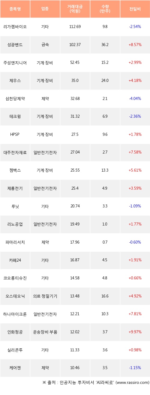 외국인 투자자의 순매수 상위 20개 종목은 리가켐바이오, 성광벤드, 주성엔지니어링, 제우스, 삼천당제약, 테크윙, HPSP, 대주전자재료, 젬백스, 제룡전기등이다.