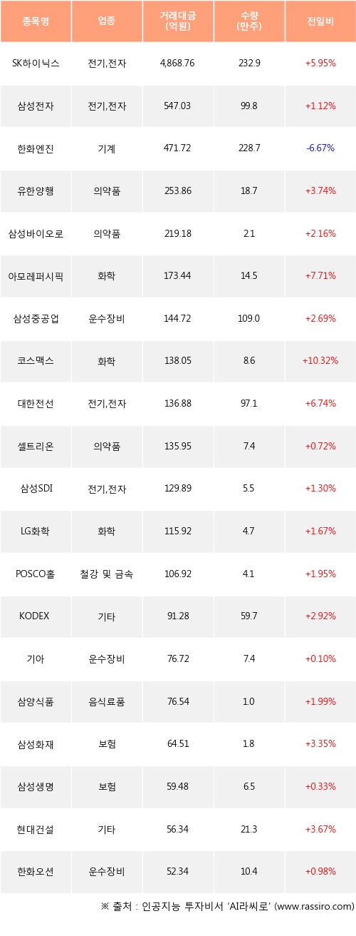 외국인 투자자의 순매수 상위 20개 종목은 SK하이닉스, 삼성전자, 한화엔진, 유한양행, 삼성바이오로직스, 아모레퍼시픽, 삼성중공업, 코스맥스, 대한전선, 셀트리온등이다.