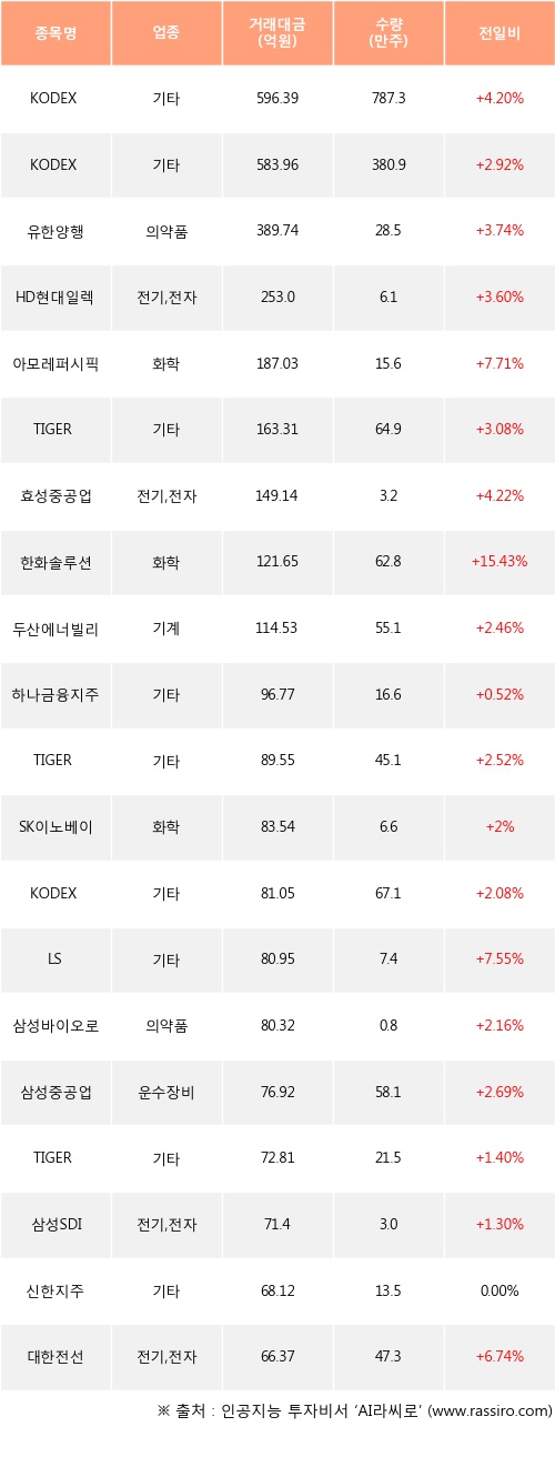 기관 투자자의 순매수 상위 20개 종목은 KODEX 코스닥150레버리지, KODEX 레버리지, 유한양행, HD현대일렉트릭, 아모레퍼시픽, TIGER 미국테크TOP10 INDXX, 효성중공업, 한화솔루션, 두산에너빌리티, 하나금융지주등이다.