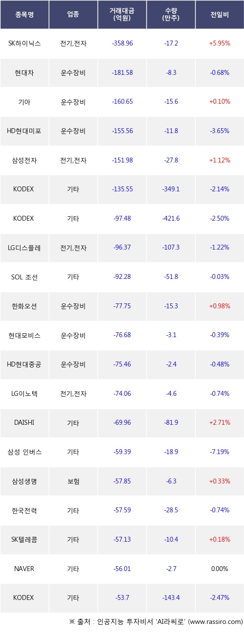 기관 투자자의 순매도 상위 20개 종목은 SK하이닉스, 현대차, 기아, HD현대미포, 삼성전자, KODEX 코스닥150선물인버스, KODEX 200선물인버스2X, LG디스플레이, SOL 조선TOP3플러스, 한화오션등이다.