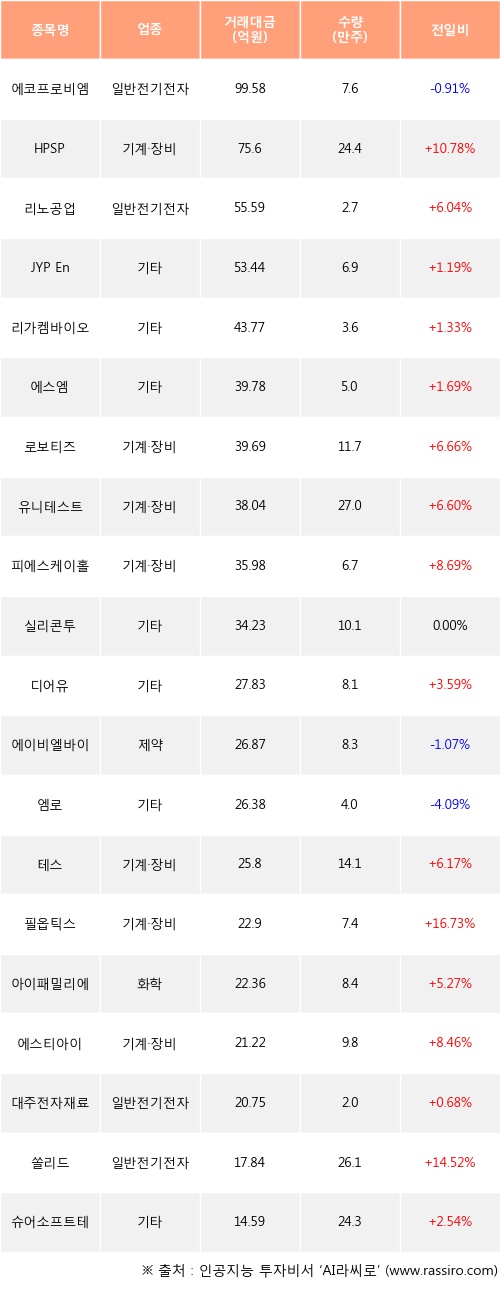 HPSP, 리노공업, JYP Ent. 등은 전일 대비 주가가 상승했고, 에코프로비엠, 에이비엘바이오, 엠로 등은 주가가 하락했다.