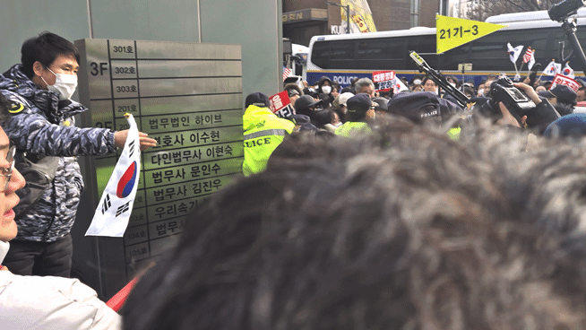 윤 대통령이 서부지법에 직접 출석하면서 경찰과 지지자들의 대치 상태도 격화하고 있다. 집회 현장을 지휘하는 경찰이 "집회시위에 관한 법률을 위반한 미신고 집회"라며 "마포경찰서 요원들이 체포할 것"이라 공지하자 지지자들은 애국가를 크게 틀어 맞섰다. 경찰은 재차 "미신고 집회에 따라 처벌이 가능하다"며 "현 시간부로 불법행위에 대해 체증하겠다"고 외쳤지만 역부족이었다.