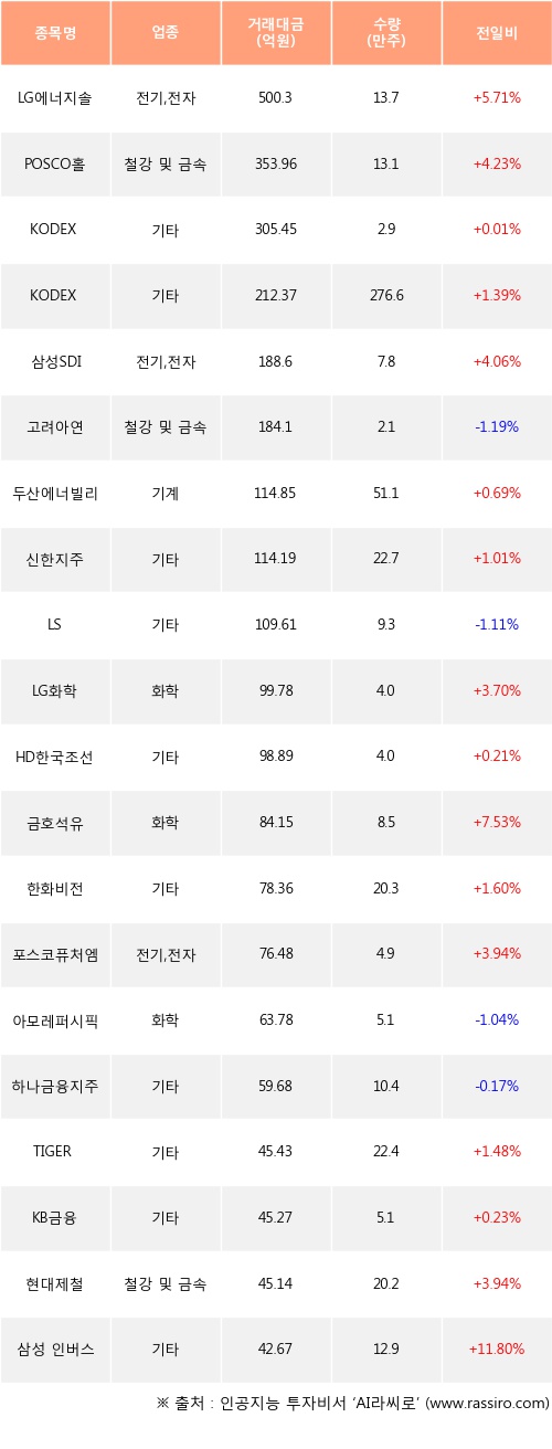 LG에너지솔루션, POSCO홀딩스, KODEX CD금리액티브(합성) 등은 전일 대비 주가가 상승했고, 고려아연, LS, 아모레퍼시픽 등은 주가가 하락했다.