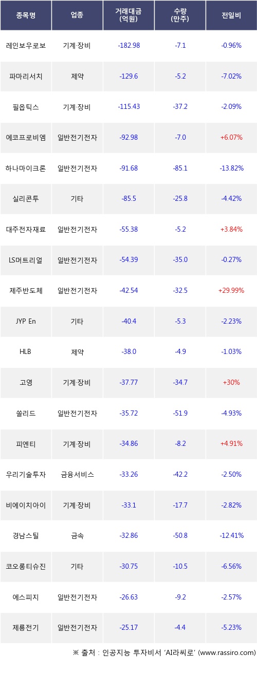 외국인 투자자의 순매도 상위 20개 종목은 레인보우로보틱스, 파마리서치, 필옵틱스, 에코프로비엠, 하나마이크론, 실리콘투, 대주전자재료, LS머트리얼즈, 제주반도체, JYP Ent.등이다.