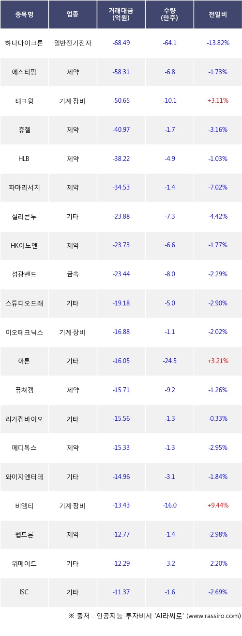 기관 투자자의 순매도 상위 20개 종목은 하나마이크론, 에스티팜, 테크윙, 휴젤, HLB, 파마리서치, 실리콘투, HK이노엔, 성광벤드, 스튜디오드래곤등이다.