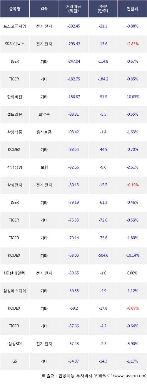 기관 투자자의 순매도 상위 20개 종목은 포스코퓨처엠, SK하이닉스, TIGER 미국S&P500, TIGER 미국배당다우존스타겟데일리커버드콜, 한화비전, 셀트리온, 삼양식품, KODEX 미국S&P500TR, 삼성생명, 삼성전자등이다.