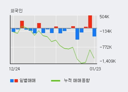지난 한달을 기준으로 보면 기관이 91.3만주를 순매수했고, 개인들도 11.5만주를 순매수했다. 반면 그동안 외국인은 106.0만주를 순매도했다. 같은 기간 이 종목의 거래비중은 외국인과 개인이 각각 21.4%, 74.0%로 비중이 높다.
