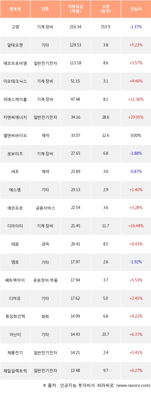 알테오젠, 에코프로비엠, 이오테크닉스 등은 전일 대비 주가가 상승했고, 고영, 로보티즈, HLB 등은 주가가 하락했다.