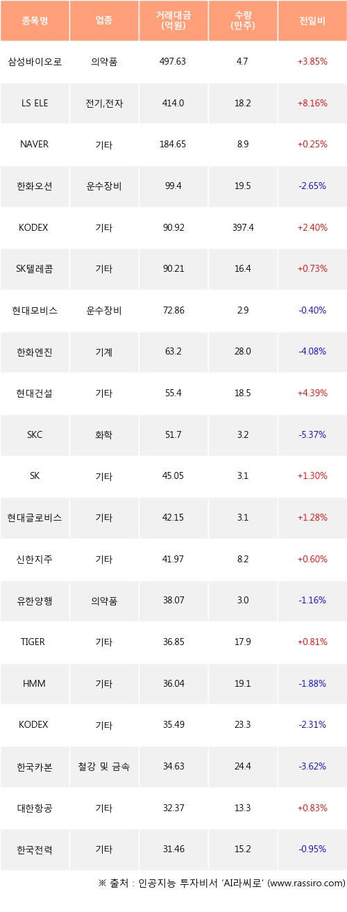 삼성바이오로직스, LS ELECTRIC, NAVER 등은 전일 대비 주가가 상승했고, 한화오션, 현대모비스, 한화엔진 등은 주가가 하락했다.