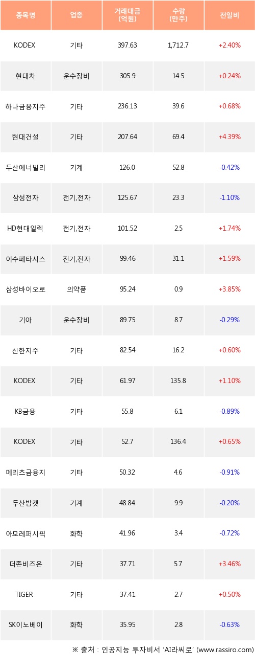 KODEX 200선물인버스2X, 현대차, 하나금융지주 등은 전일 대비 주가가 상승했고, 두산에너빌리티, 삼성전자, 기아 등은 주가가 하락했다.