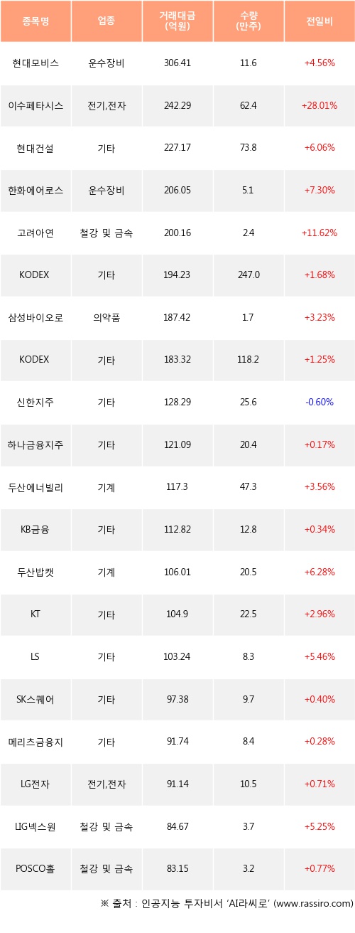 현대모비스, 이수페타시스, 현대건설 등은 전일 대비 주가가 상승했고, 신한지주 등은 주가가 하락했다.