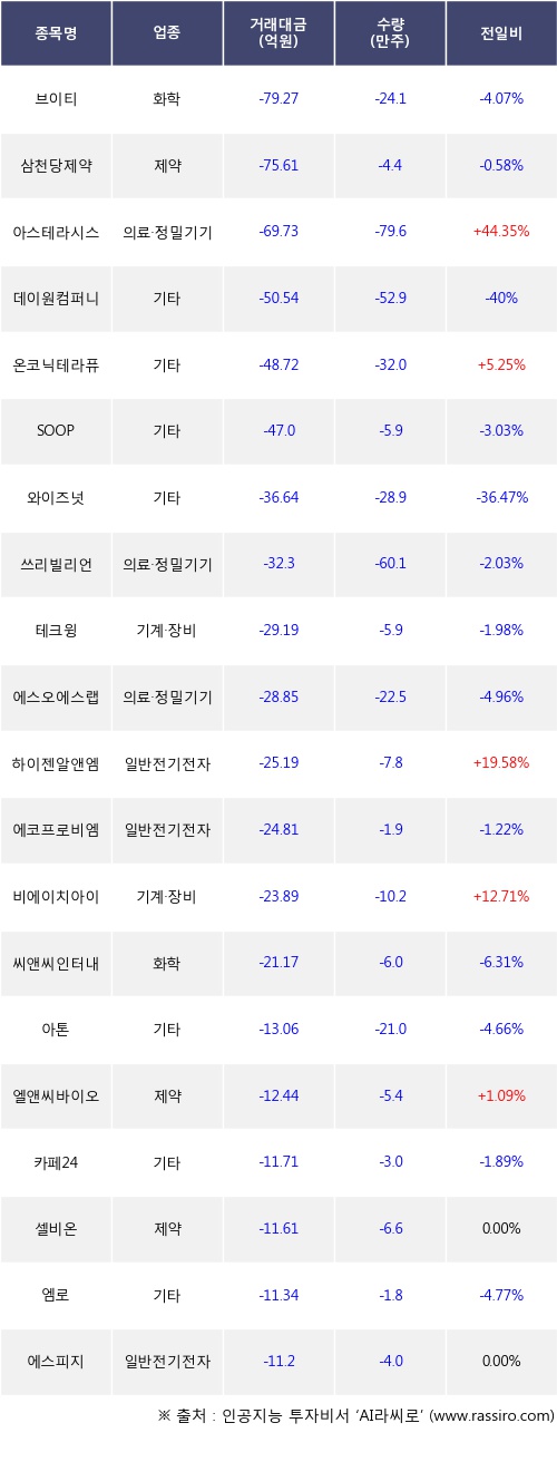기관 투자자의 순매도 상위 20개 종목은 브이티, 삼천당제약, 아스테라시스, 데이원컴퍼니, 온코닉테라퓨틱스, SOOP, 와이즈넛, 쓰리빌리언, 테크윙, 에스오에스랩등이다.