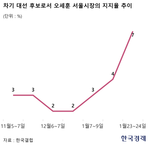 이 같은 오 시장의 행보는 지지율에도 긍정적인 흐름으로 나타났습니다. 12월 중순 바닥을 쳤던 그의 지지율은 올 들어 꾸준히 상승해 지난 23~24일 중앙일보 의뢰로 한국갤럽이 실시한 조사에서 7%까지 올라섰지요. 이재명 민주당 대표와의 양자대결에서 경쟁 후보들 가운데 가장 앞선 43%(이재명 46%) 지지율을 얻기도 했습니다.
