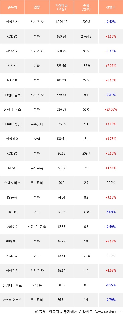 KODEX 200선물인버스2X, 카카오, NAVER 등은 전일 대비 주가가 상승했고, 삼성전자, 산일전기, HD현대일렉트릭 등은 주가가 하락했다.