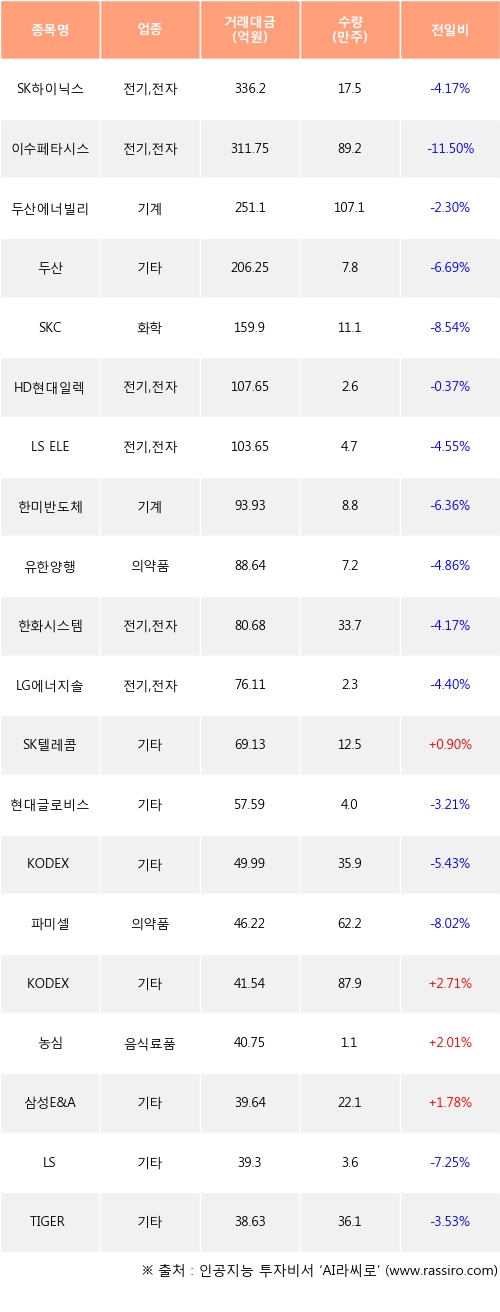 SK텔레콤, KODEX 인버스, 농심 등은 전일 대비 주가가 상승했고, SK하이닉스, 이수페타시스, 두산에너빌리티 등은 주가가 하락했다.