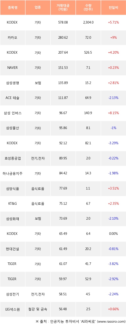 KODEX 200선물인버스2X, 카카오, KODEX 코스닥150선물인버스 등은 전일 대비 주가가 상승했고, ACE 테슬라밸류체인액티브, 삼성물산, KODEX 미국AI테크TOP10타겟커버드콜 등은 주가가 하락했다.