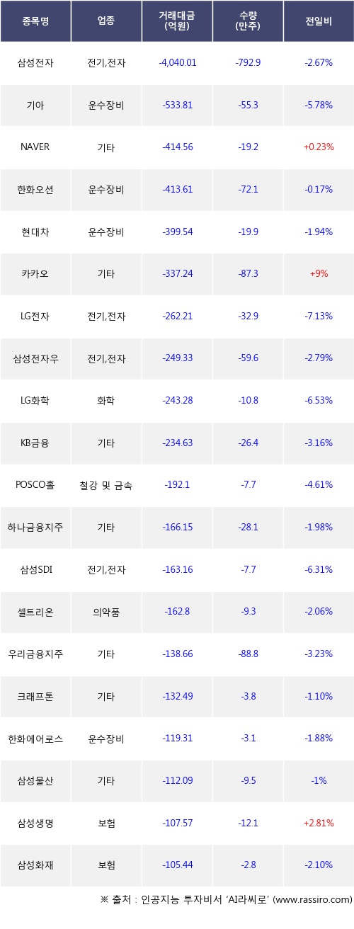 외국인 투자자의 순매도 상위 20개 종목은 삼성전자, 기아, NAVER, 한화오션, 현대차, 카카오, LG전자, 삼성전자우, LG화학, KB금융등이다.