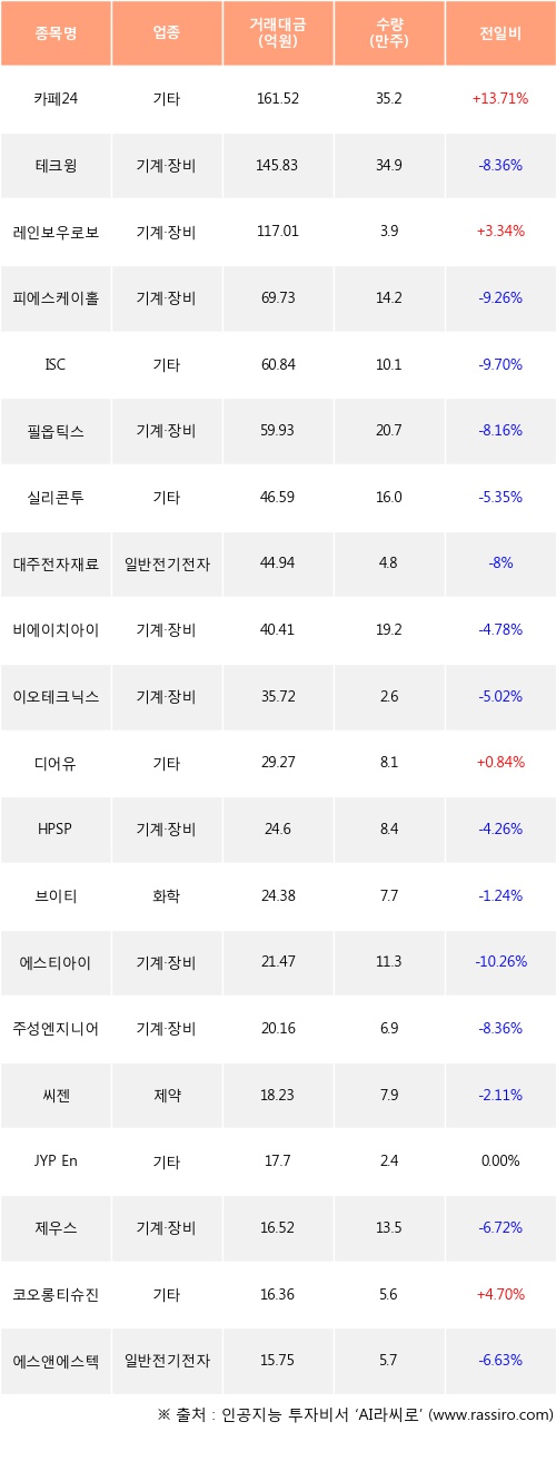 카페24, 레인보우로보틱스, 디어유 등은 전일 대비 주가가 상승했고, 테크윙, 피에스케이홀딩스, ISC 등은 주가가 하락했다.