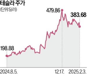 테슬라 주가는 3일(현지시간) 5.17% 하락한 383.68달러에 장을 마쳤다. 테슬라 주가는 지난달 30일 400달러 선을 회복한 지 불과 며칠 만에 다시 밑으로 내려왔다. 지난해 11월 6일 도널드 트럼프 미국 대통령 당선 확정 이후 폭등하기 시작해 12월 17일 사상 최고치인 479.86달러까지 올랐다가 급등락을 반복하고 있다.테슬라 비중이 높은 상장지수펀드(ETF)의 수익률도 부진하다. 코스콤에 따르면 테슬라 비중이 25%가 넘는 ‘KODEX 테슬라밸류체인FactSet’ ETF의 최근 한 달 수익률은 -5.01%다. 테슬라와 테슬라 레버리지 비중이 40%에 달하는 ‘ACE 테슬라밸류체인액티브’ ETF도 한 달 수익률이 -4.71%에 그쳤다.