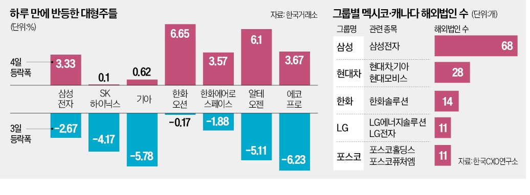 멕시코와 캐나다에 해외 법인을 둔 증시 대표주는 긴장의 끈을 놓지 못하고 있다. 관세 유예가 한 달짜리 한시적 조치라서다. 기업 분석 전문업체 한국CXO연구소에 따르면 국내 주요 대기업집단 중에선 삼성(68개), 현대자동차(28개), 한화(14개), LG(11개) 등이 멕시코와 캐나다에 해외 법인을 많이 운영하고 있다.