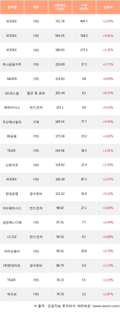 이날 기관 투자자가 순매수한 종목들 중에 KODEX 레버리지, KODEX 코스닥150레버리지, KODEX 200 등은 전일 대비 주가가 상승했다.
