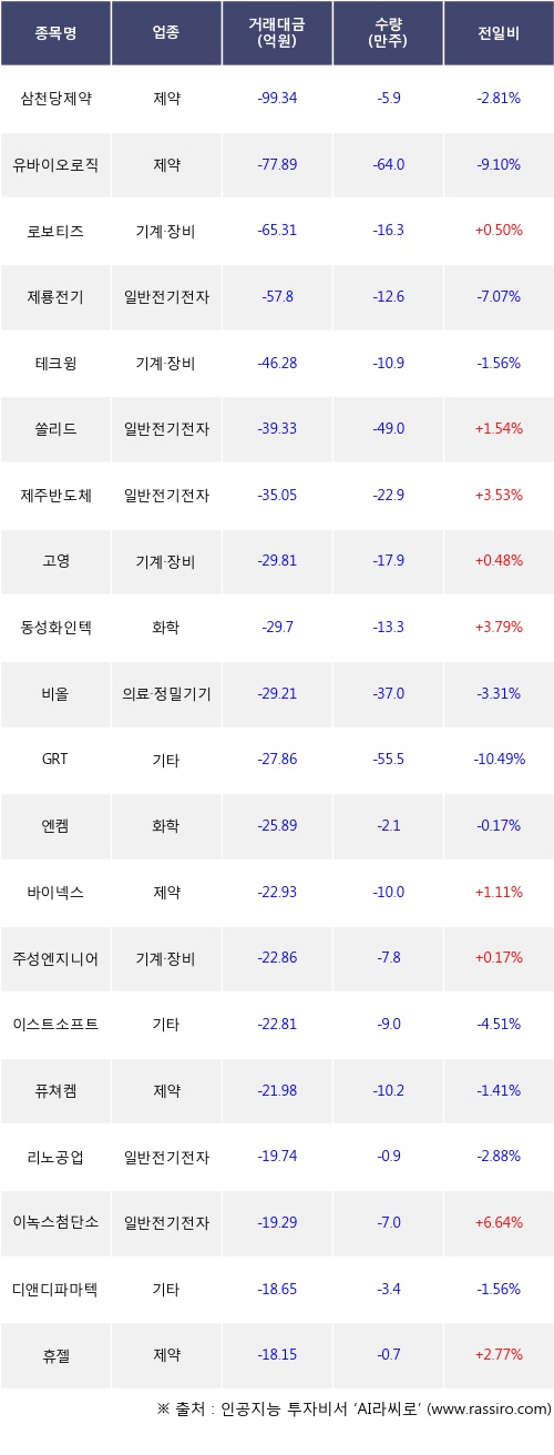 외국인 투자자의 순매도 상위 20개 종목은 삼천당제약, 유바이오로직스, 로보티즈, 제룡전기, 테크윙, 쏠리드, 제주반도체, 고영, 동성화인텍, 비올등이다.