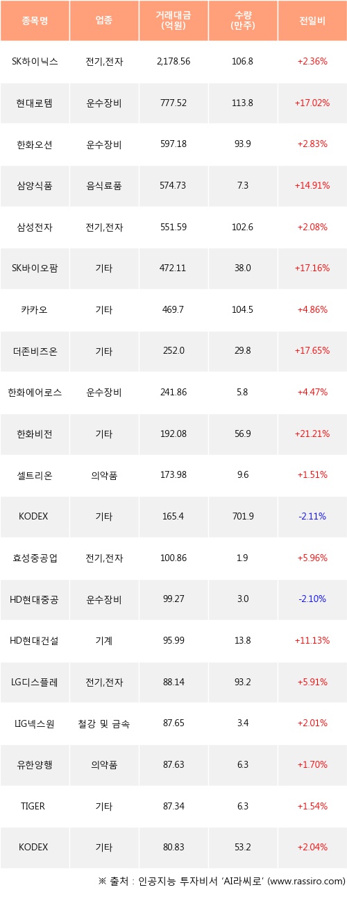 외국인 투자자의 순매수 상위 20개 종목은 SK하이닉스, 현대로템, 한화오션, 삼양식품, 삼성전자, SK바이오팜, 카카오, 더존비즈온, 한화에어로스페이스, 한화비전등이다.