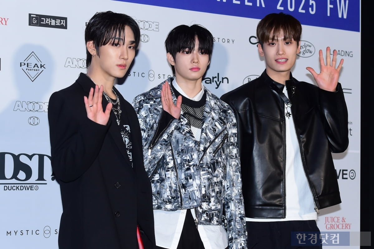 그룹 TIOT 김민성, 신예찬, 금준현이 7일 오후 서울 동대문디자인플라자(DDP)에서 열린 '2025 F/W 서울패션위크' DUCKDIVE(덕다이브, 박준민 디자이너) 패션쇼에 참석해 포토타임을 갖고 있다.변성현 한경닷컴 기자 byun84@hankyung.com