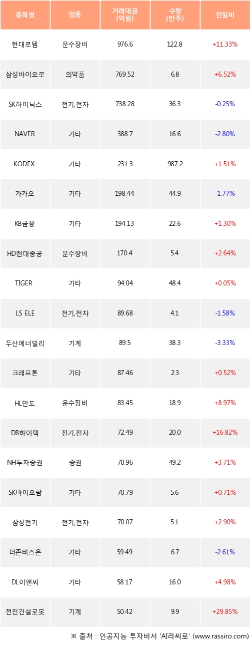 현대로템, 삼성바이오로직스, KODEX 200선물인버스2X 등은 전일 대비 주가가 상승했고, SK하이닉스, NAVER, 카카오 등은 주가가 하락했다.