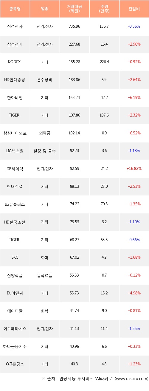 삼성전기, KODEX 코스닥150레버리지, HD현대중공업 등은 전일 대비 주가가 상승했고, 삼성전자, LIG넥스원, HD한국조선해양 등은 주가가 하락했다.