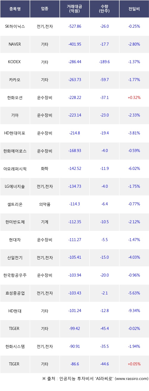 기관 투자자의 순매도 상위 20개 종목은 SK하이닉스, NAVER, KODEX 레버리지, 카카오, 한화오션, 기아, HD현대미포, 한화에어로스페이스, 아모레퍼시픽, LG에너지솔루션등이다.