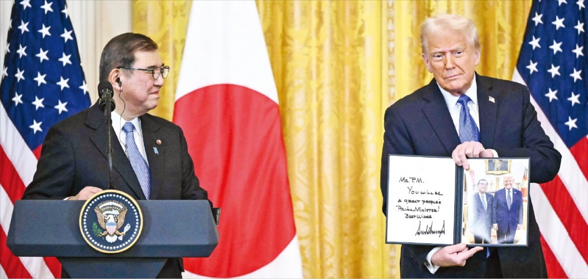이시바 총리는 정상회담 기자회견에선 애드리브로 주목받았다. ‘미국이 일본에 추가 관세를 부과하면 일본은 보복 관세를 부과하느냐’는 미국 기자의 질문에 “가정적 질문엔 답할 수 없다는 것이 일본의 의회 답변 방식”이라고 해 행사장에 웃음을 자아냈다. 트럼프 대통령은 “아주 좋은 답변”이라며 “총리는 자신이 무엇을 해야 할지 알고 있다”고 만족감을 표시했다. 이시바 총리는 트럼프 대통령이 지난해 7월 유세 도중 총격으로 귀를 다쳤을 때 찍힌 사진을 언급하며 “역사에 남을 한 장”이라고 치켜세우기도 했다.