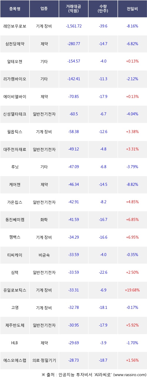외국인 투자자의 순매도 상위 20개 종목은 레인보우로보틱스, 삼천당제약, 알테오젠, 리가켐바이오, 에이비엘바이오, 신성델타테크, 필옵틱스, 대주전자재료, 루닛, 케어젠등이다.