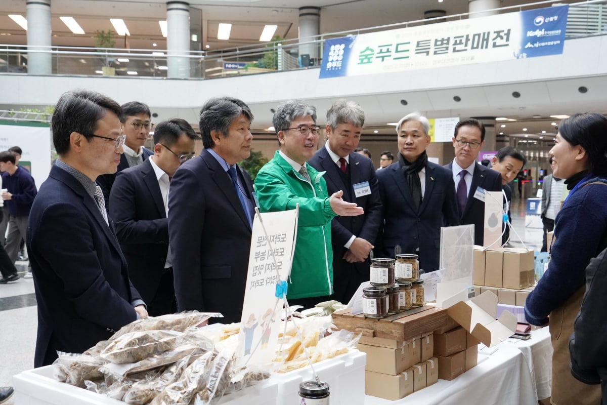 임상섭 산림청장(가운데)이 11일 정부대전청사에서 임업인들이 생산한 임산물을 선보이는 숲푸드 특별판매전을 열고 임산물 소비 촉진에 나서고 있다. 임 청장은 이날 정부대전청사 브리핑 룸에서 산림에서 생산되는 건강한 임산물을 국민이 더욱 쉽게 접할 수 있도록 ‘먹거리 임산물 소비 활성화 대책’을 수립해 발표했다. 산림청 제공
