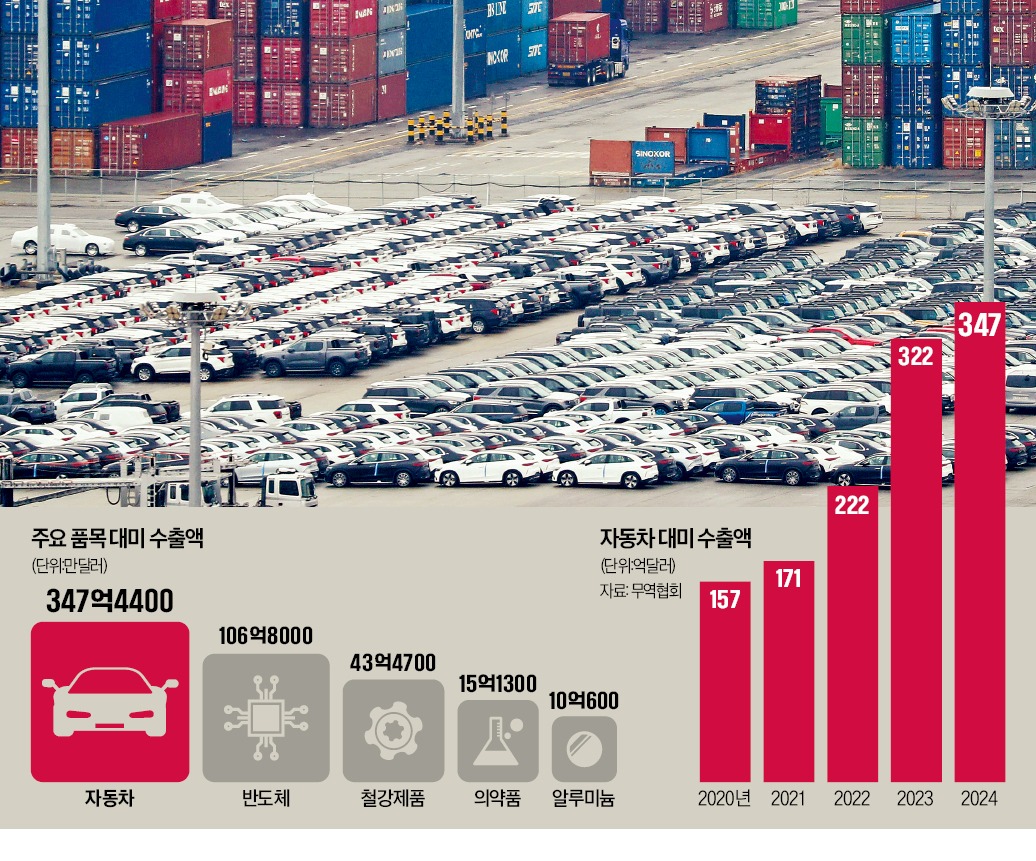143만 대. 지난해 미국행 선박에 실린 ‘메이드 인 코리아’ 자동차 수다. 전체 자동차 수출 물량(279만 대)의 절반 이상이 미국으로 향했다. 한국 대미 수출액의 27.2%(347억달러·약 50조원)를 차지하는 1등 품목이다. ‘넘버 2’는 지난해 106억달러(약 15조원)어치 수출된 반도체다.“자동차, 반도체, 의약품 등의 관세를 검토하겠다”는 도널드 트럼프 미국 대통령의 10일(현지시간) 발언을 놓고 “한국을 겨냥한 것”이란 해석이 나오는 이유다. 트럼프 대통령이 퍼붓는 ‘관세 폭탄’의 강도와 범위가 예상을 넘어서자 국내 산업계에 비상이 걸렸다.