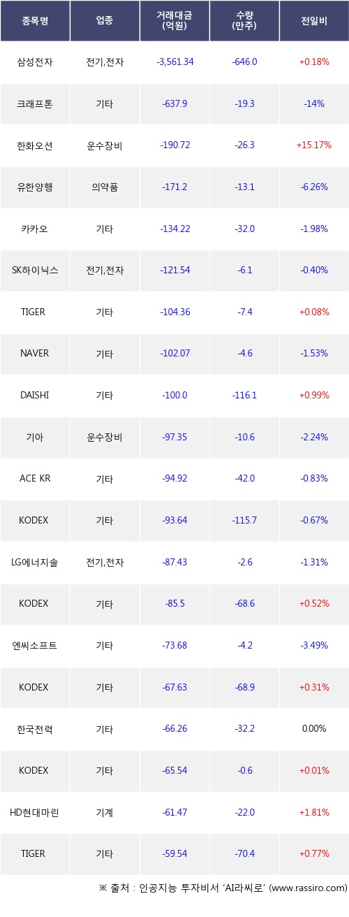 기관 투자자의 순매도 상위 20개 종목은 삼성전자, 크래프톤, 한화오션, 유한양행, 카카오, SK하이닉스, TIGER 미국나스닥100, NAVER, DAISHIN343 AI반도체&인프라액티브, 기아등이다.