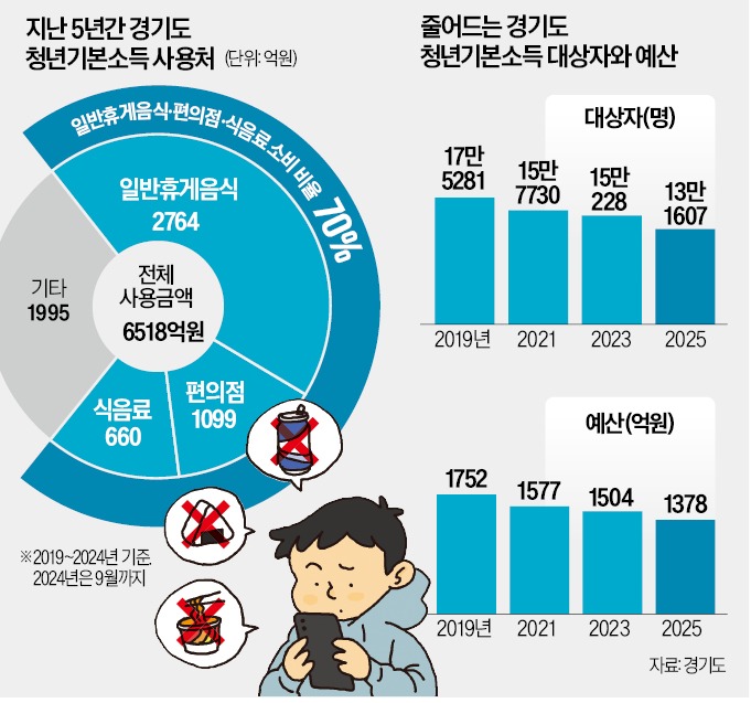 신씨는 “지역화폐로 지급돼 파주에서만 써야 했는데, 경기 북부권에는 취업 준비 학원이 많지 않아 활용성이 크게 떨어졌다”며 “결국 식당, 카페, 편의점 등에서 먹고 마시는 데 대부분을 쓸 수밖에 없었다”고 말했다. 실제 경기 북부에는 청년기본소득을 사용할 수 있는 가맹점이 경기 남부의 절반도 되지 않는다.