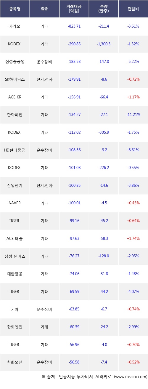 기관 투자자의 순매도 상위 20개 종목은 카카오, KODEX 200선물인버스2X, 삼성중공업, SK하이닉스, ACE KRX금현물, 한화비전, KODEX 코스닥150선물인버스, HD현대중공업, KODEX 인버스, 산일전기등이다.