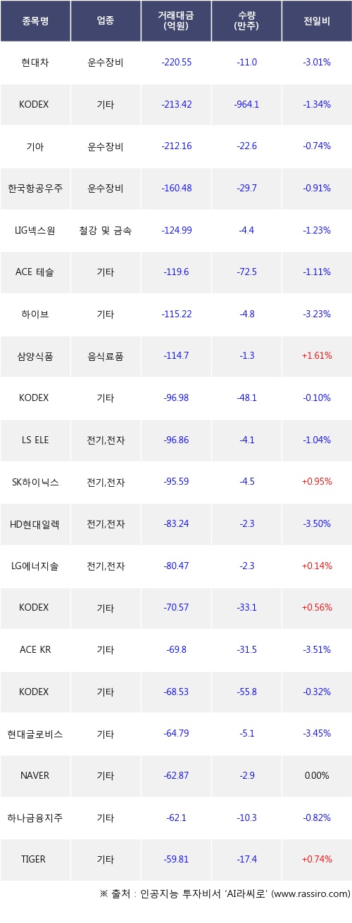 기관 투자자의 순매도 상위 20개 종목은 현대차, KODEX 200선물인버스2X, 기아, 한국항공우주, LIG넥스원, ACE 테슬라밸류체인액티브, 하이브, 삼양식품, KODEX 미국S&P500, LS ELECTRIC등이다.