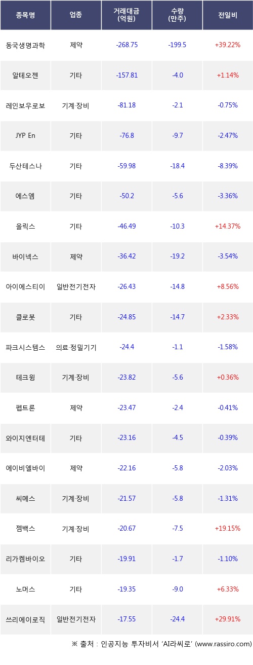 기관 투자자의 순매도 상위 20개 종목은 동국생명과학, 알테오젠, 레인보우로보틱스, JYP Ent., 두산테스나, 에스엠, 올릭스, 바이넥스, 아이에스티이, 클로봇등이다.
