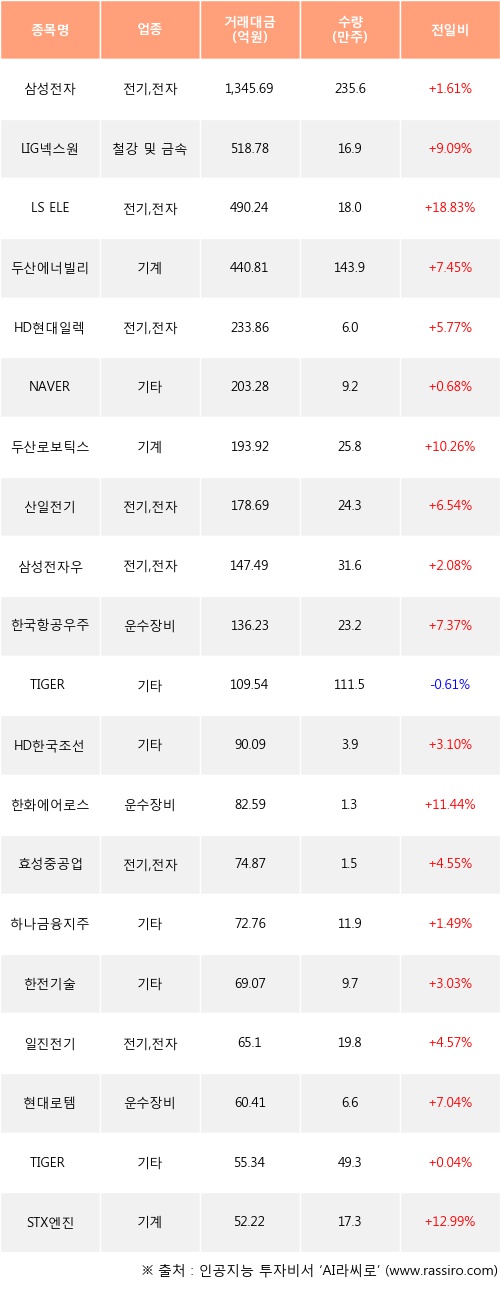 외국인 투자자의 순매수 상위 20개 종목은 삼성전자, LIG넥스원, LS ELECTRIC, 두산에너빌리티, HD현대일렉트릭, NAVER, 두산로보틱스, 산일전기, 삼성전자우, 한국항공우주등이다.