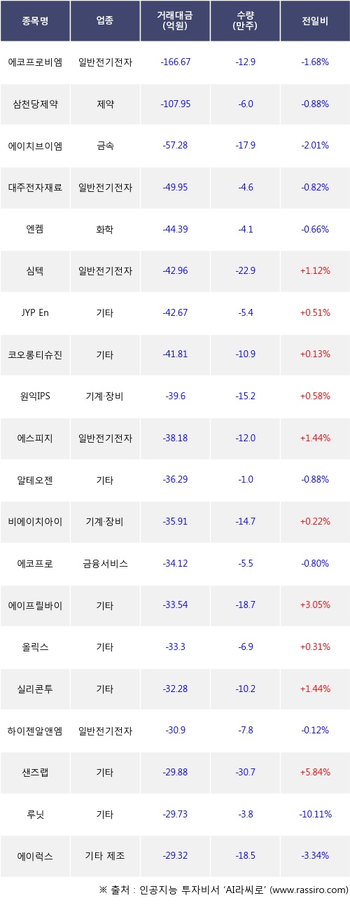 외국인 투자자의 순매도 상위 20개 종목은 에코프로비엠, 삼천당제약, 에이치브이엠, 대주전자재료, 엔켐, 심텍, JYP Ent., 코오롱티슈진, 원익IPS, 에스피지등이다.