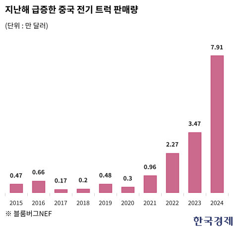 중국의 중·대형 트럭의 전기화 속도가 예상을 뛰어넘고 있는 것으로 드러났다.18일(현지시간) 블룸버그통신에 따르면 지난해 중국에서 무공해 트럭 약 8만 대가 판매됐다. 이는 2023년 대비 두 배 이상 증가한 수치로, 3년 전과 비교하면 25배나 증가했다. 8만 대 중 대부분이 배터리가 장착된 대형전기트럭이었고, 4000대가량은 수소전기트럭이었다.