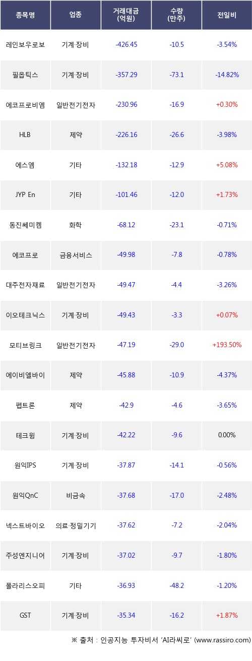 외국인 투자자의 순매도 상위 20개 종목은 레인보우로보틱스, 필옵틱스, 에코프로비엠, HLB, 에스엠, JYP Ent., 동진쎄미켐, 에코프로, 대주전자재료, 이오테크닉스등이다.