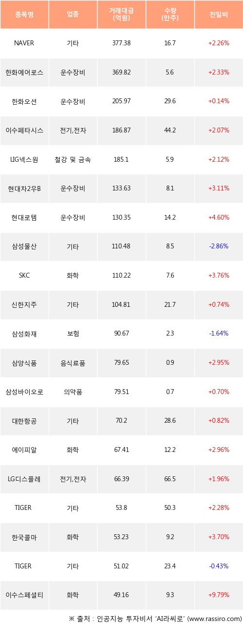 외국인 투자자의 순매수 상위 20개 종목은 NAVER, 한화에어로스페이스, 한화오션, 이수페타시스, LIG넥스원, 현대차2우B, 현대로템, 삼성물산, SKC, 신한지주등이다.