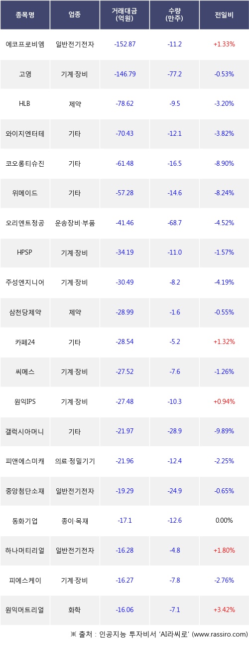 외국인 투자자의 순매도 상위 20개 종목은 에코프로비엠, 고영, HLB, 와이지엔터테인먼트, 코오롱티슈진, 위메이드, 오리엔트정공, HPSP, 주성엔지니어링, 삼천당제약등이다.