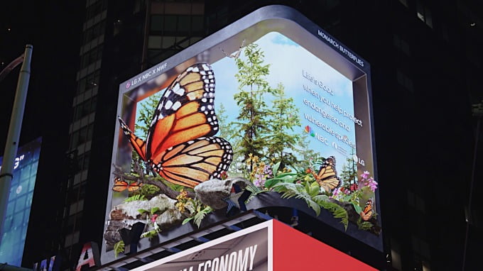 LG전자가 ESG 활동 강화 차원에서 전 세계 멸종위기종 보호 캠페인을 확대할 방침이다. LG전자는 미국 뉴욕 타임스스퀘어 전광판에 ‘LG와 함께하는 멸종위기종 보호 캠페인(The LG Endangered Species Series)’의 다섯 번째 영상 ‘모나크 나비(Monarch Butterfly, 제왕나비)’편을 공개했다.