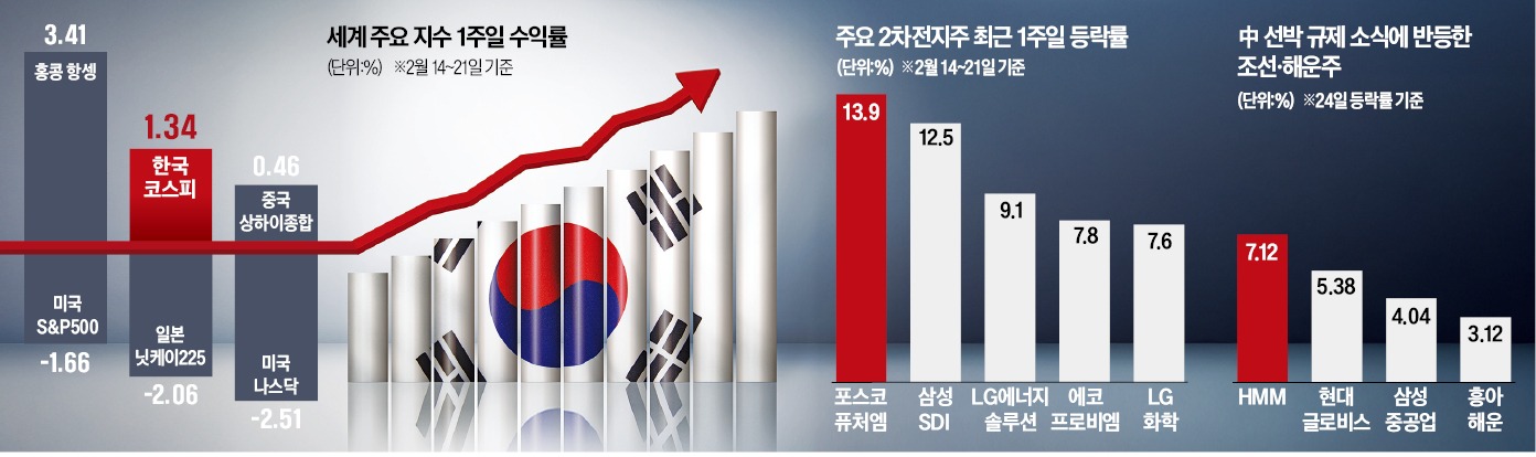 지수를 떠받친 건 2차전지와 해운주였다. 대중국 규제 강화 소식이 전해진 덕분이다. LG에너지솔루션이 1.85% 올랐고 삼성SDI는 6.7% 급등했다. 포스코케미칼(5.01%) 에코프로머티(5.21%) 등도 큰 폭으로 상승했다. 글로벌 규제로 배터리산업에서도 중국 입지가 약해질 것이란 전망이 반영됐다는 평가다. 중국에 비판적인 프리드리히 메르츠 독일 기독민주당 대표의 총리직이 유력해지자 유럽에서 ‘K배터리’가 반사이익을 얻을 것이란 기대도 커졌다. 한병화 유진투자증권 연구원은 “K배터리는 중국에 대한 견제가 있어야 지속 성장할 수 있다”고 짚었다.