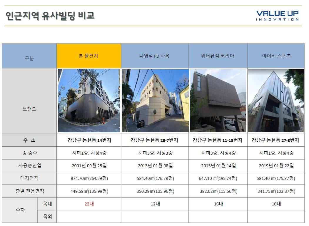 대부분의 강남권 도심지는 좁은 도로와 밀집된 건축물로 인해 건물 활용도가 제한적인 경우가 많습니다. 하지만 본 건물은 넓은 필지 전면을 갖추고 있으며, 삼면이 도로에 접해 있어 개방감과 접근성이 뛰어납니다. 따라서, 출입구 배치, 외관 디자인, 업종에 따른 공간 기획 등의 밸류업을 진행한다면, 해당 지역의 브랜드 정체성을 높일 수 있는 랜드마크 건물로 재탄생할 가능성이 높습니다.