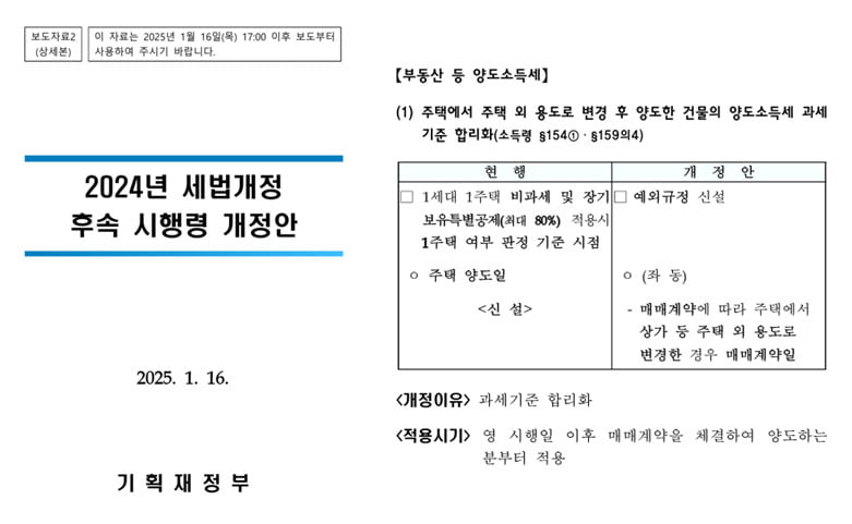 2025년 1월 16일 발표된 세법 개정안에 따라 매도인이 주택을 처분할 경우, 주택 기준으로 양도소득세 및 장기보유특별공제(장특공) 혜택을 받을 수 있어 세금 부담이 감소합니다. 반면, 매수인은 상가로 취득할 수 있어 용도변경 측면에서 유연성이 확보됩니다.